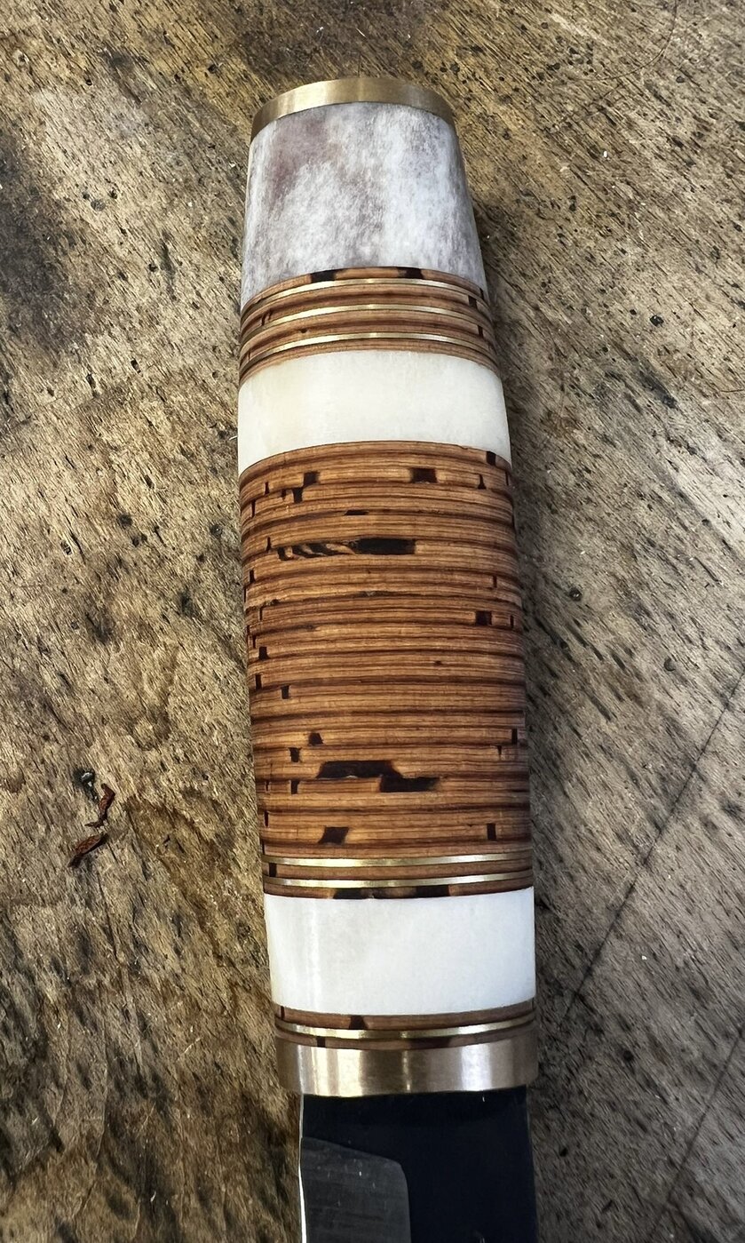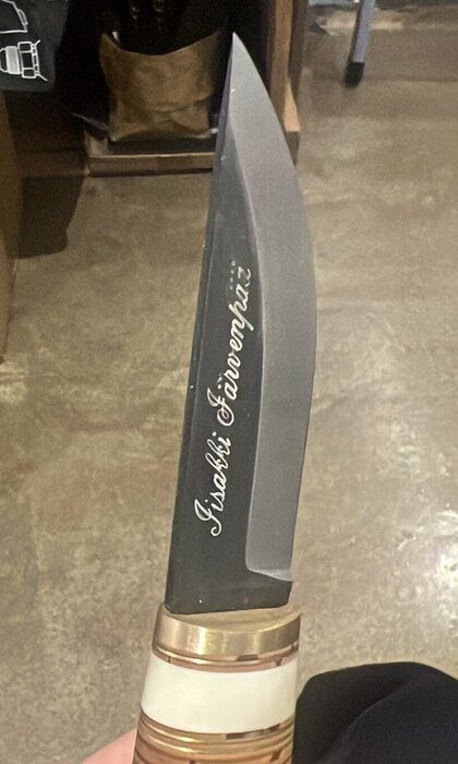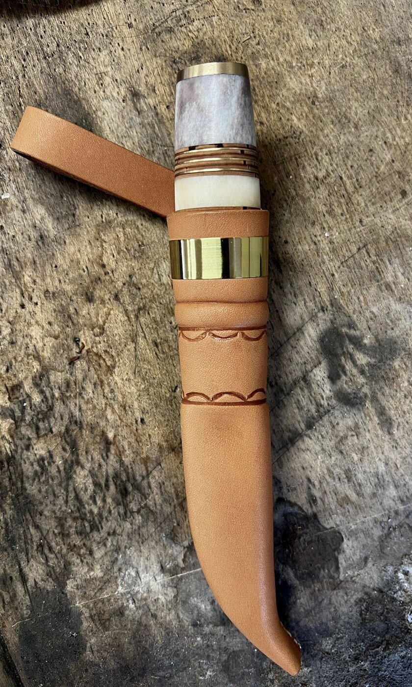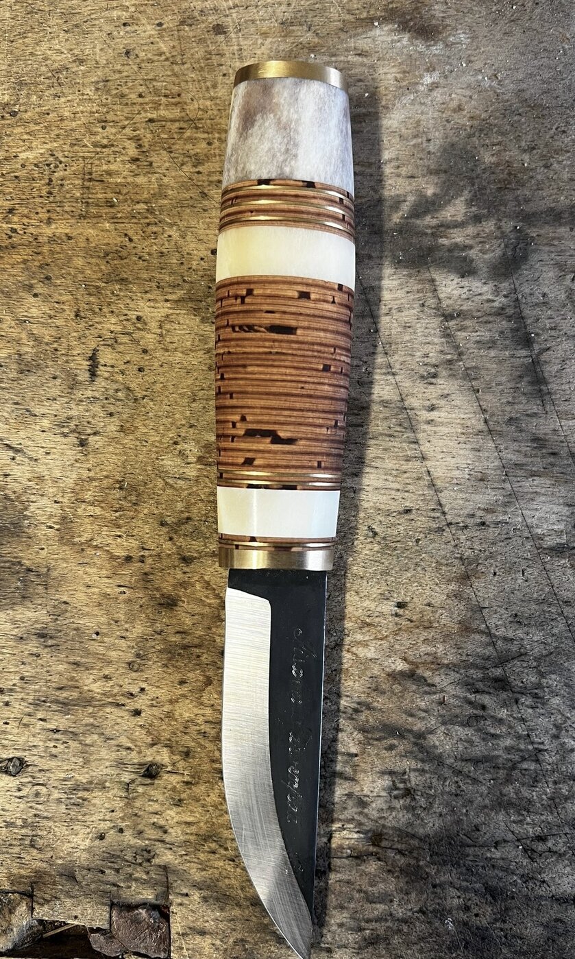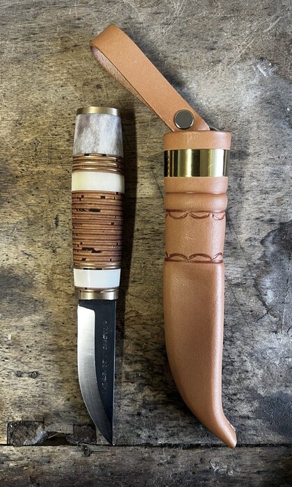 Puukot » Keräily / juhlamallit » Luu-Uniikki Luu-Uniikki Poronluupuukko mustalla hiiliterästerällä Luu-uniikki on nimensä mukaisesti uniikki. Jokainen tekemistämme luu-uniikeista on erilainen, mutta kaikissa on pala suomalaista poronsarvea kahvassa. Tässä puukossa on 8 cm musta hiiliterästerä. Kahvassa on poronluun lisäksi koivuntuohilappuja sekä nahka- ja messinkilevyjä. Tuppi on vaaleaa kasviparkittua naudannahkaa messinkiheloituksin. Lisätiedot ›Full product description › 253,00 € Kaiverrus käsin terään + 5,00 € Kaiverrus koneella terään + 15,00 € Näytä mallikuvat eri kaiverruksista ›Show example images from engravings › Kaiverrus käsin teräänKaiverrus koneella terään Määrä Tuotekoodi 850600 Saatavuus Ei saatavana!