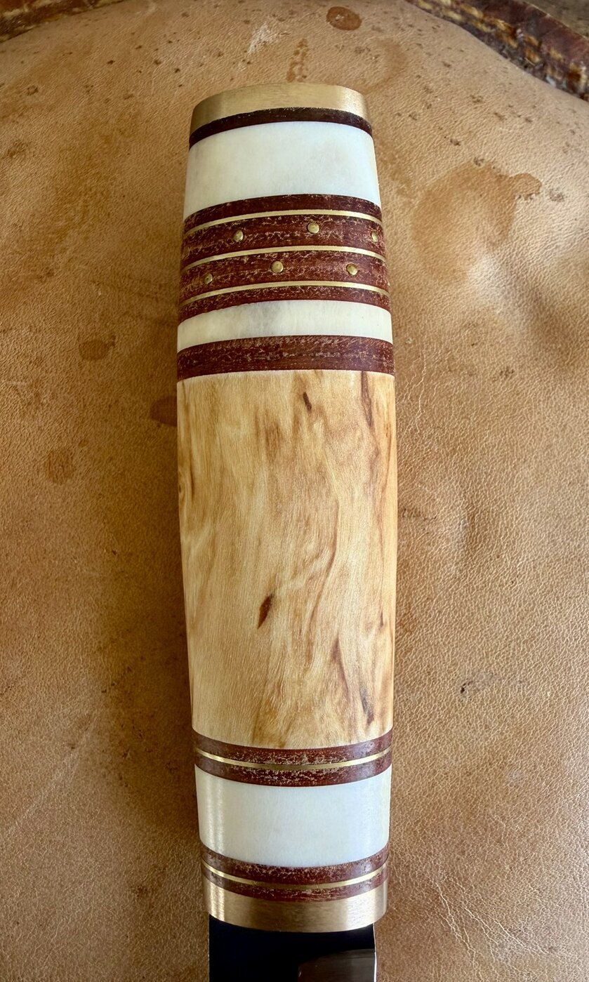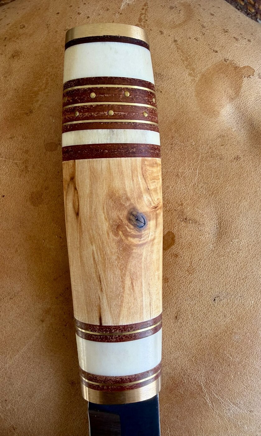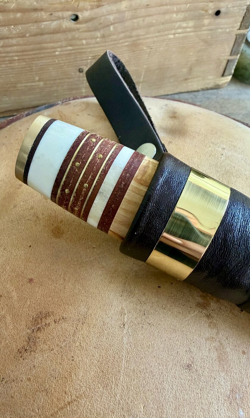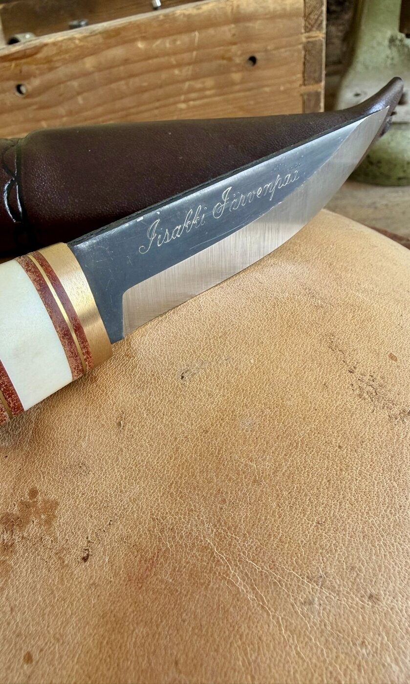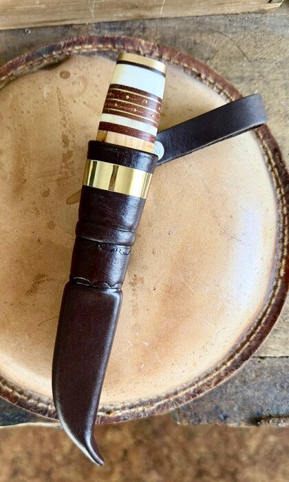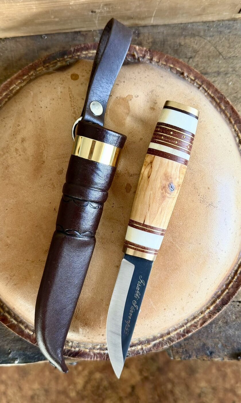 Tässä puukossa on 8 cm musta hiiliterästerä. Kahvassa on poronluun lisäks nahka- ja messinkilevyjä sekä messinkinauloja, päissä valetut pronssihelat. Tuppi on tummanruskeaa kasviparkittua naudannahkaa messinkiheloituksin.