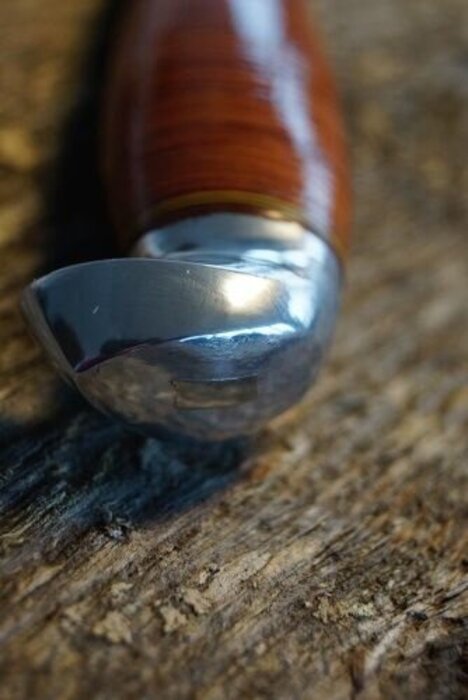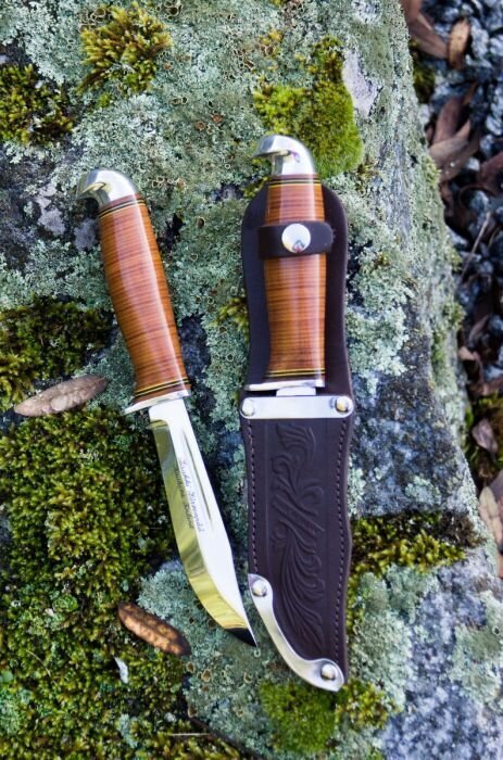 Hiiliteräksiseen terään haettiin muotoa USA:n perinteistä löytyvistä malleista. Kahva koostuu nahkalapuista, jotka on tuppien teosta yli jäävästä materiaalista lyöty ja kotimaista naudan kasvisparkkinahkaa. Kahva on pinnoitettu lakalla. Terän ja kahvan välissä on 3 mm paksusta alumiinista lyöty sormisuoja, mikä estää tehokkaasti sormien luiskahtamisen terään. Puukon päässä on alumiinista valettu ylähela, ns. koukku. Ylähelan muoto on peräisin 1921 kehitetystä Vuolupuukon koivuisesta päästä.