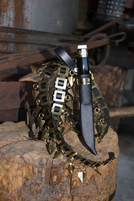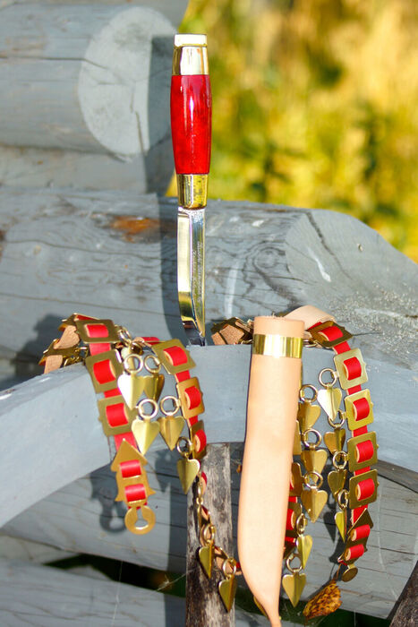 Materiaalit: Puukon kahva visakoivua ja messinkiä, terä kiillotettua hiiliterästä, tuppi naudannahkaa ja messinkiä, vyö nahkaa ja messinkiä.
