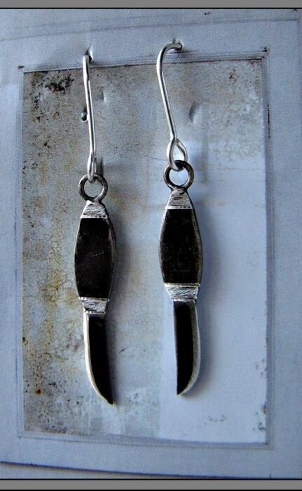 The Pikku-Iisakki knife-motif earrings are made of 925 silver and don’t contain nickel. They are entirely handmade and cast in silver at our own factory. The dark details are achieved with patina. The earrings are available in both hook and stud styles; this one is attached with a hook.