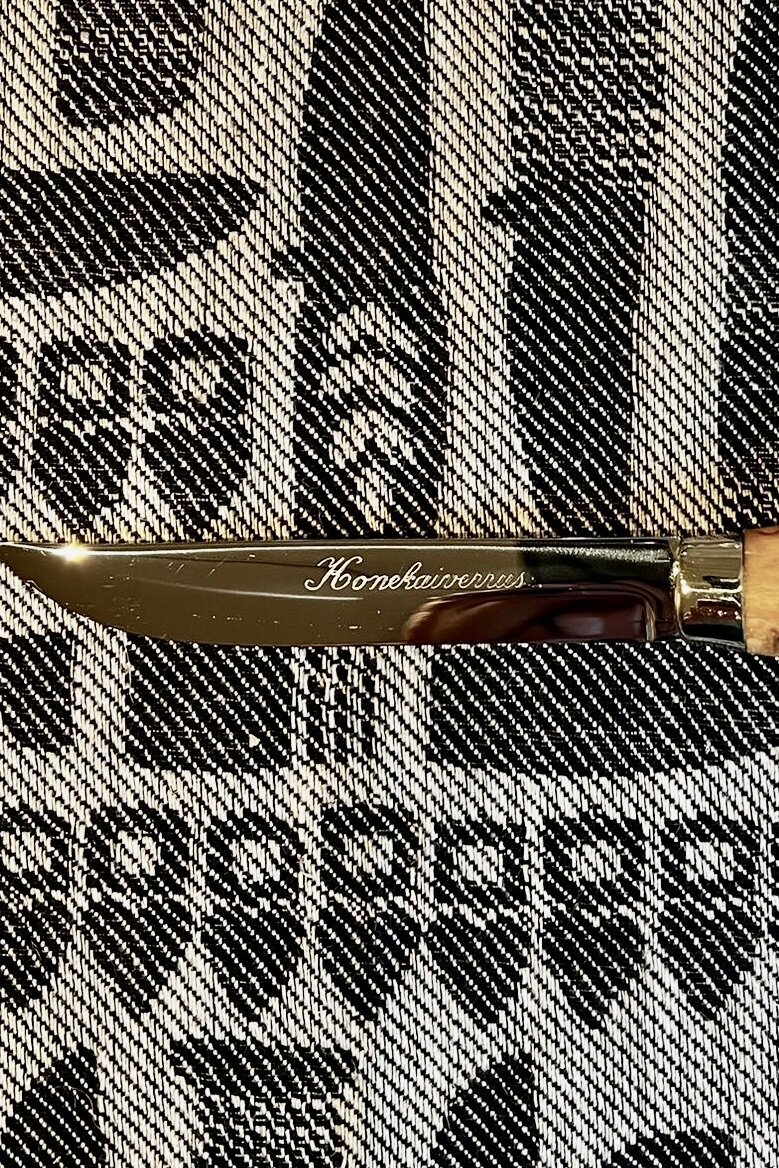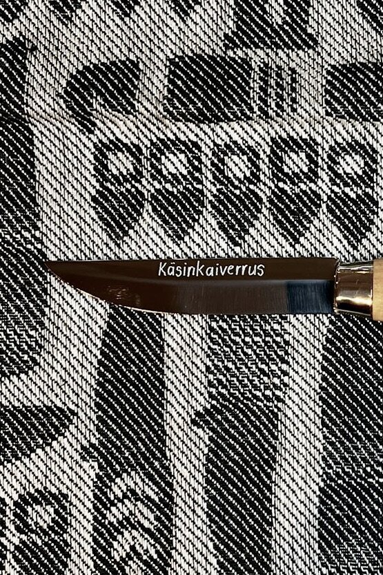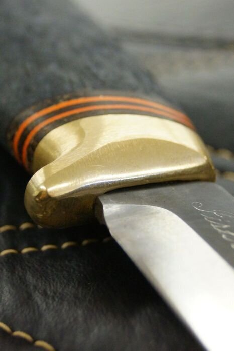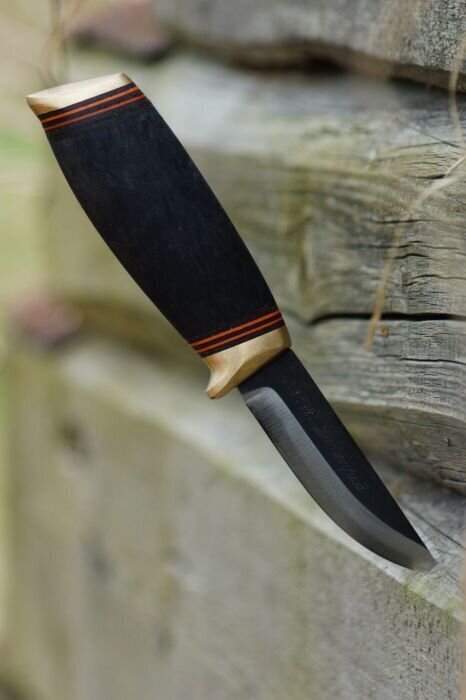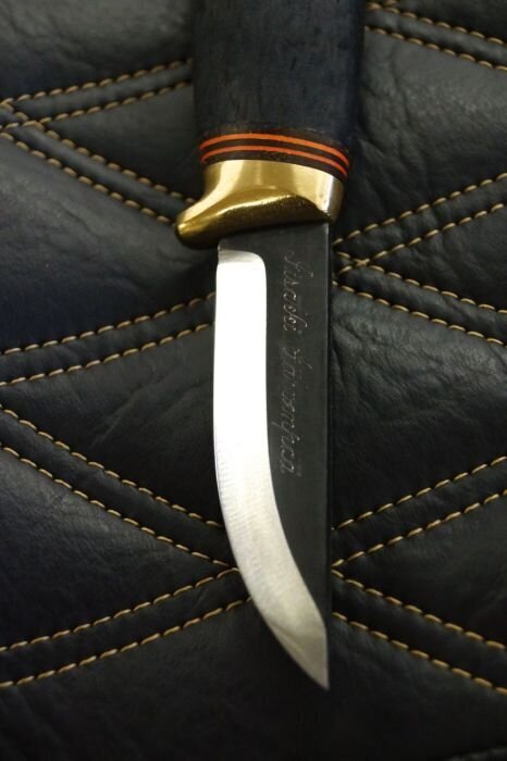 The Tramp knife boasts a black 8 cm high-carbon steel blade and cast bronze fittings. The blade is left unpolished after pressing, its black color produced by the heat of the hardening furnace. The blade is finished with a whetstone to refine the edge and engraved with Iisakki Järvenpää's name, while the rest of the blade remains black.