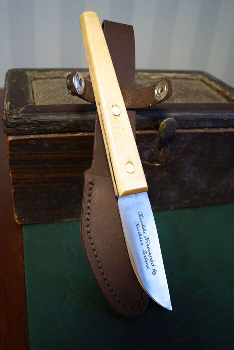 The Strenberg factory has since been sold and the smoke has cleared, but our knife factory's stock still contained these decades-old blades and birch handle blanks. Therefore, the Cigar Knife was reintroduced into our production. At the same time, a leather sheath was developed to protect it.