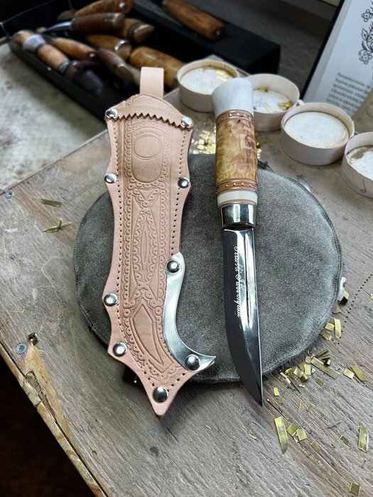 This knife has an 10 cm polished carbon steel blade and a handle that, in addition to reindeer bone, is made of curly birch, brass plates and brass nails. The light brown sheath is made of cow leather.