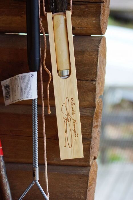 The wooden, oiled sheath not only protects the knife but also serves as a fish stunning tool. It allows you to hold the fish by the tail while gutting and floats along with the knife if it accidentally falls into the water. The leather carrying strap keeps the knife securely in the sheath during transport.