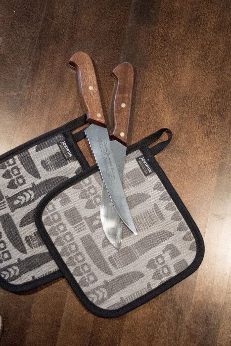 The knives feature lacquered teak handles and stainless steel blades. Hand wash only, not dishwasher-safe. The potholder is made of 50% linen, 50% cotton, and can be washed at 60°C.
