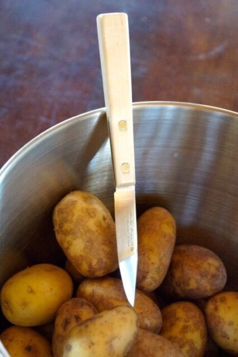 The potato knife's blade is made from stainless steel, and the handle is oiled birch. The knife's length is 19 cm, with a blade length of 8 cm. You can also order text engraving for the knife if desired. The knife is delivered in a corrugated cardboard box.