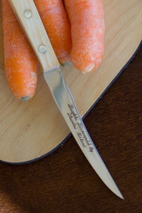 The Potato Knife and serrated Tomato Knife are approximately 19 cm long, with blade lengths of 8 cm. The Mini Fillet Knife measures 21 cm in total, with a 10 cm blade. Hand engraving on the knife blades is available upon request. The knife set is delivered in a corrugated cardboard box.