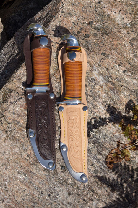 The sheath is made of dark or light brown leather and stitched all around. The tip of the sheath features a reinforcement made of polished stainless steel. The design on the sheath is done by pressing.