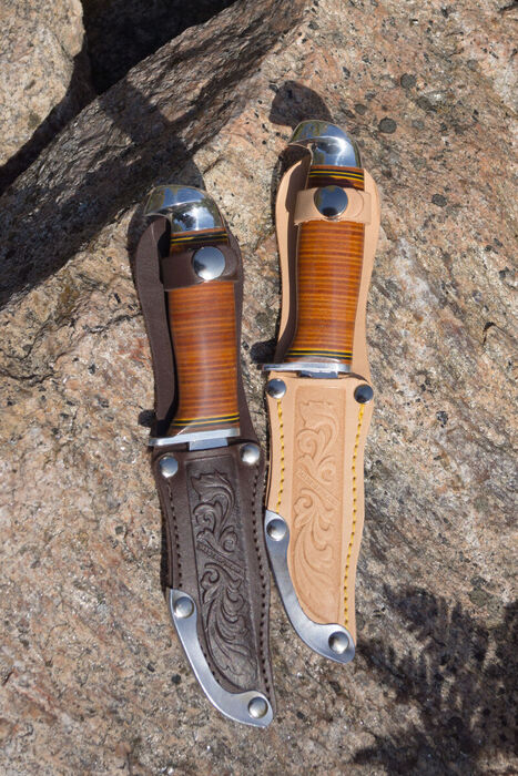 The shape of the carbon steel blade was inspired by traditional U.S. models. The handle consists of leather discs punched out from excess material from sheath production, made of domestic vegetable-tanned cowhide. The handle is coated with lacquer. Between the blade and handle is a 3 mm thick aluminum guard that effectively prevents fingers from slipping onto the blade. The top cap, or hook, is cast from aluminum, with a design based on the wooden end of the Whittle Knife, developed in 1921.