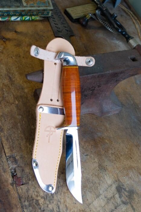 The shape of the polished carbon steel blade was inspired by traditional American designs. The handle is constructed from surplus leather discs left over from sheath production, using high-quality Finnish vegetable-tanned cowhide. The blade is separated from the handle by a 3 mm thick aluminum guard, which prevents fingers from slipping onto the blade. The upper pommel, featuring a hook design, is made from cast aluminum and was derived from the 1921 Whittle Knife model.