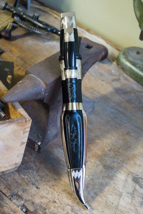 The red-handled Härmä Double Knife, known in Finnish as “Kaksneuvoonen”, is a traditional part of the Ostrobothnian folk costume for men. The knives in this variation feature black, painted birch handles and hand-engraved nickel silver ferrules. The blade is polished carbon steel.