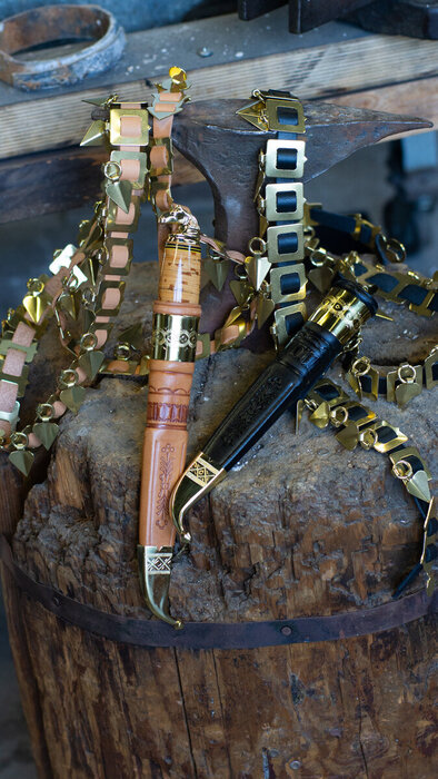 Today, the horse head's shape remains the same and the handle is still made from lacquered birch bark. The Horse Head Knife is produced in three sizes: the traditional model with a 10 cm polished carbon steel blade, the longer-bladed Vallesmanni, and the smaller Ladies's Knife.