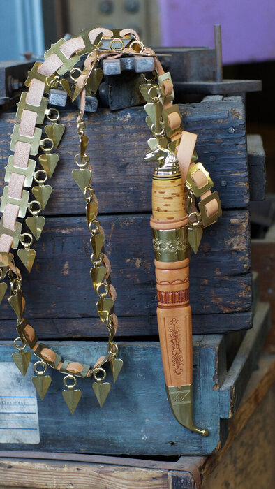 The sheath of the Horse Head Knife is made from light or black leather, featuring a decorative brass tip and traditional patterning on the leather. The sheath is the same as that of the Ball Pommel Kauhava Knife.