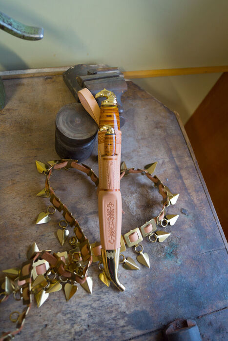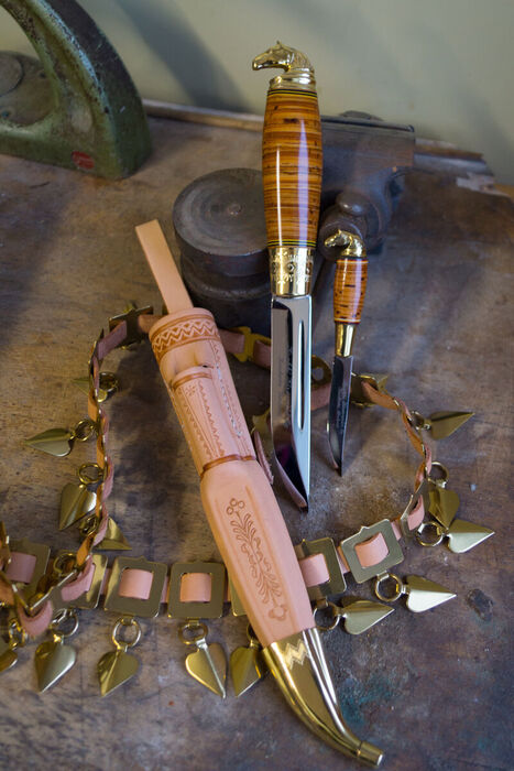 The Double Knife set consists of two knives in a single sheath. It combines a larger knife with a 10 cm blade alongside a smaller knife with a 6 cm blade, both featuring brass horse-head pommels. This set includes a matching Helavyö belt made of light leather with brass heart fittings. The belt is 115 cm long and can be shortened by removing some of the fittings.