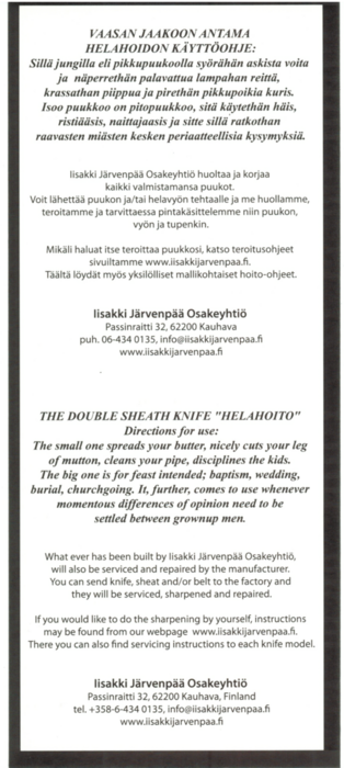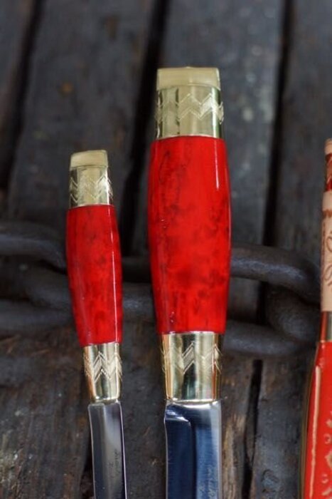 The red-handled Härmä Double Knife, known in Finnish as “Kaksneuvoonen”, is a traditional part of the Ostrobothnian folk costume for men. The knives in this variation feature red, painted birch handles and hand-engraved brass ferrules. The blade is polished carbon steel.