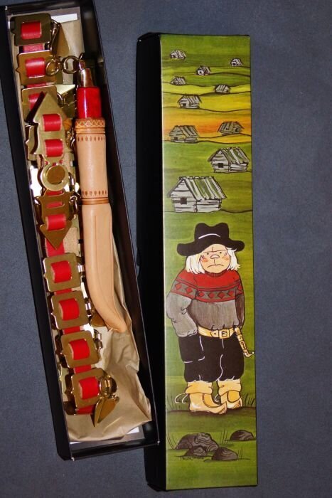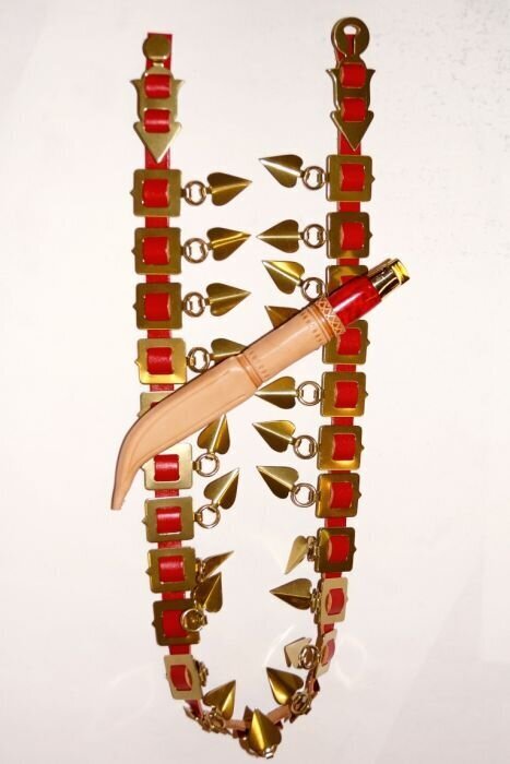 The children's Helavyö belt measures 70 cm, featuring traditional red leather and brass fittings. The belt can be easily shortened to fit as needed. The children's Junki features the handle part of the smaller knife from the adult's Double Knife Härmä Knife set, without the blade.