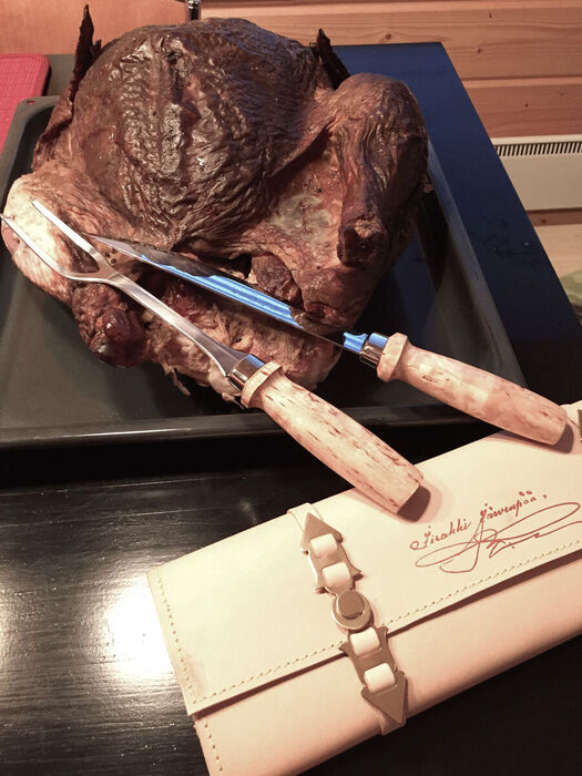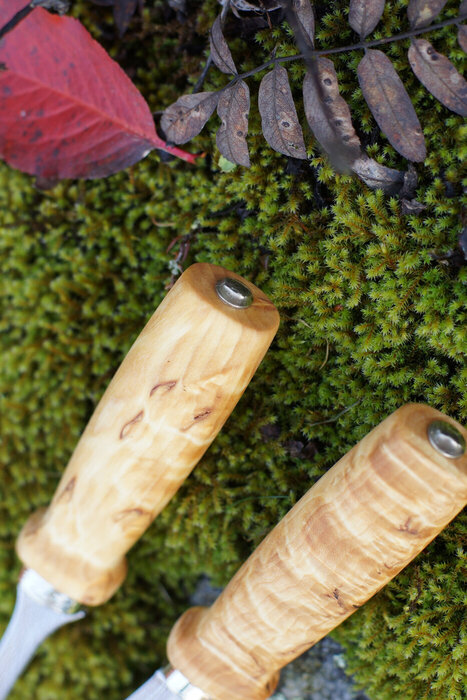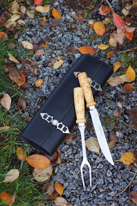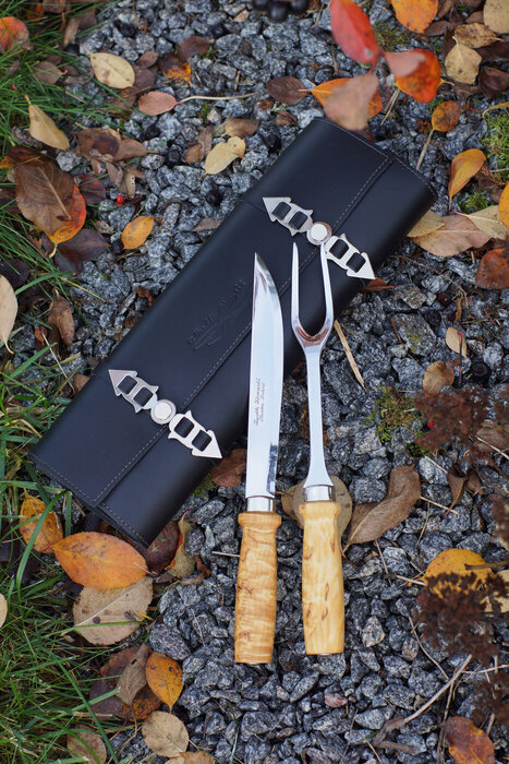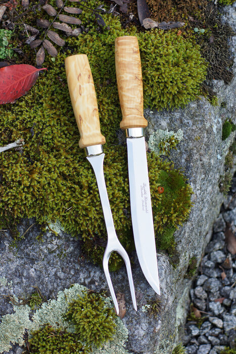 The traditional Peijais Set is back in our collection. The set includes a robust carving knife and fork, both featuring striking burl birch handles. The blades are made of stainless steel, known for its durability.