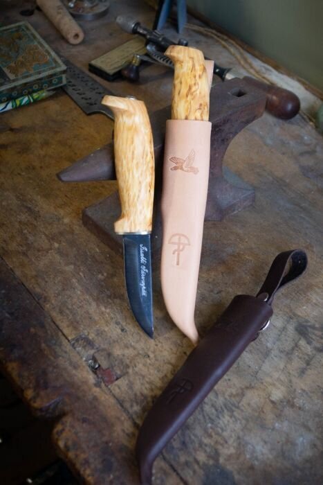 The sheath is available in either light or dark brown and is adorned with a duck motif and the Ilkan partiolaiset logo.