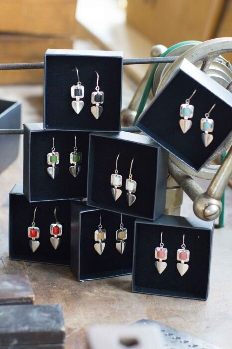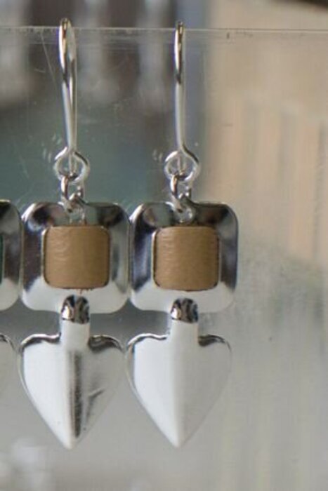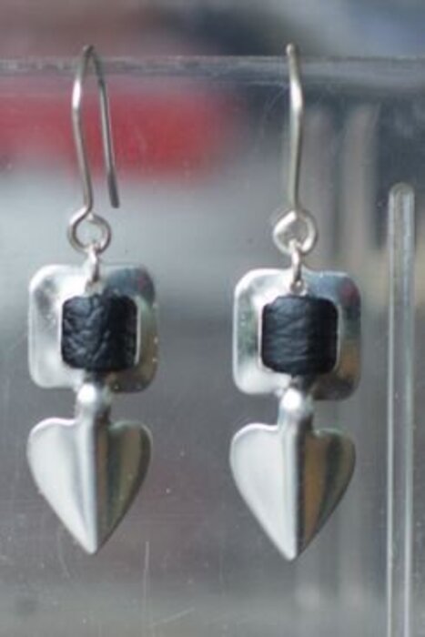 Silver heart-shaped earrings handcrafted at our factory in Kauhava. Attaches with a hook. The leather colors available are black, white, red, baby blue, light green, pink, and cappuccino. Also check out our matching Helakoru necklaces!