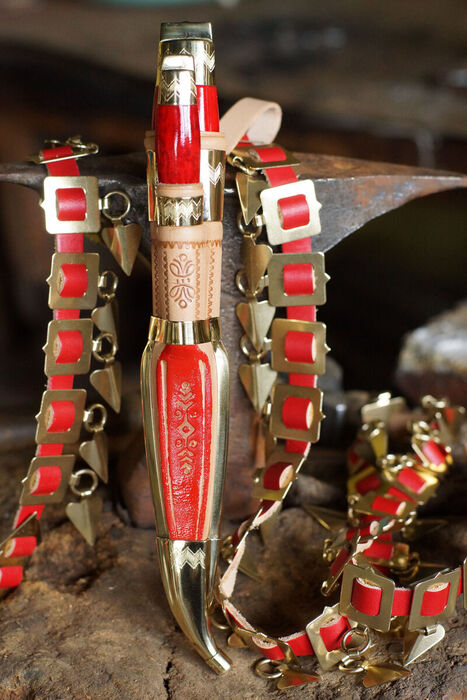 Tupen ja puukkojen koristekaiverrukset on tehty käsin kaivertamalla, eli "tikkelöimällä". Esim. Helavyön helojen kiinnityslenkit kierretään edelleen langasta ja sahataan käsin.