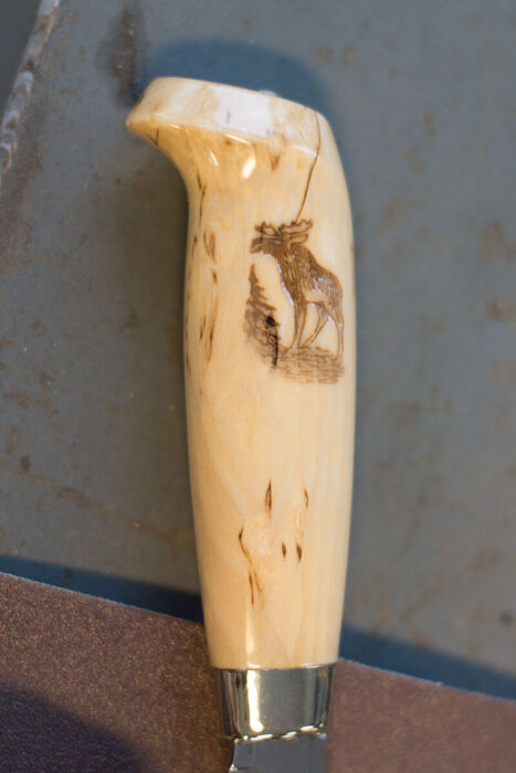 Tämä on hyvin perinteinen, aina suosittu 1920-luvun malli Hirvijahtipuukosta. Sen terä on 15 cm pituinen ja ruostumatonta terästä. Visakoivuinen kahva on lakattu ja siihen on poltettu hirven kuva. Tässä perinteisessä mallissa ei ole sormisuojaa kahvan alaosassa, vaan uushopeasta prässätty alahela terän ja kahvan välissä.