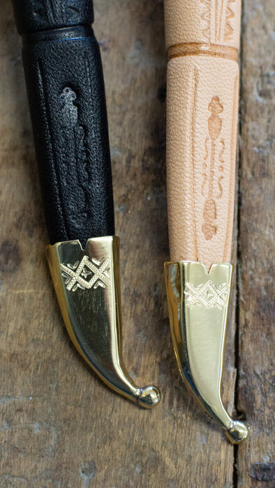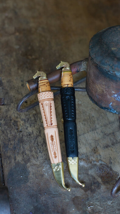 Nahkainen tuppi on valinnan mukaan joko luonnon vaalea tai musta, ja siinä on messinkinen kärkihela kuten isommissakin malleissa. Puukon voi yksilöidä kaiverruttamalla esim. omistajan nimen puukon terään. Puukon pituus on 12 cm, terä 6 cm.